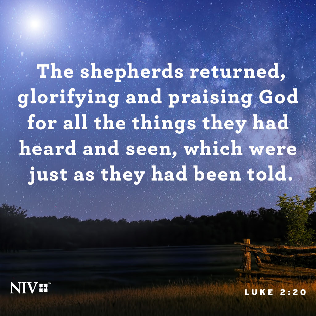 “The shepherds returned, glorifying and praising God for all they had heard and seen, as it had been told them.” (Luke 2:20)